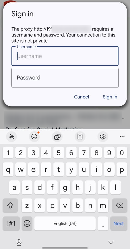 Persistent Pop-up Issue: After connecting to the proxy, you may see frequent authentication pop-ups when opening webpages. If you navigate away or the pop-up disappears, you'll need to reload the page to sign in again.