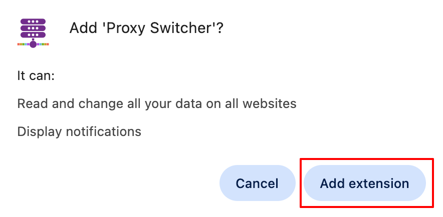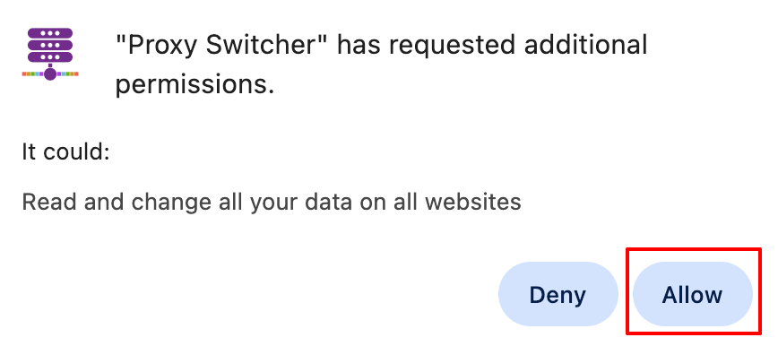 - A permission prompt will appear: "Proxy Switcher has requested additional permissions"