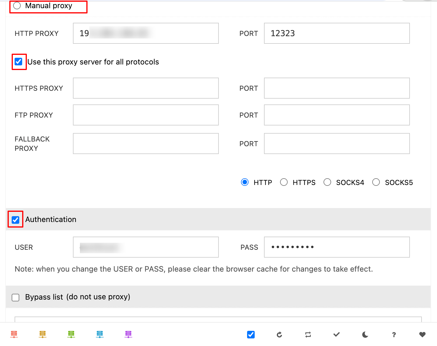 - Select the Manual Proxy radio button to activate